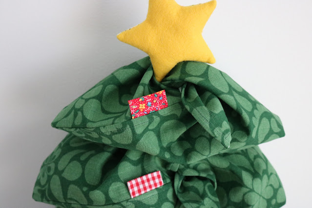 Prepare the tag. Cut a rectangle of fabric that is 3" x 2 1/4". Press a 3/4" fold into each short side of the rectangle, so that wrong sides are touching (left diagram). Press. Fold in half perpendicular to the previous folds, so that the edges of the previous folds are hidden (right diagram). Align edges, press.